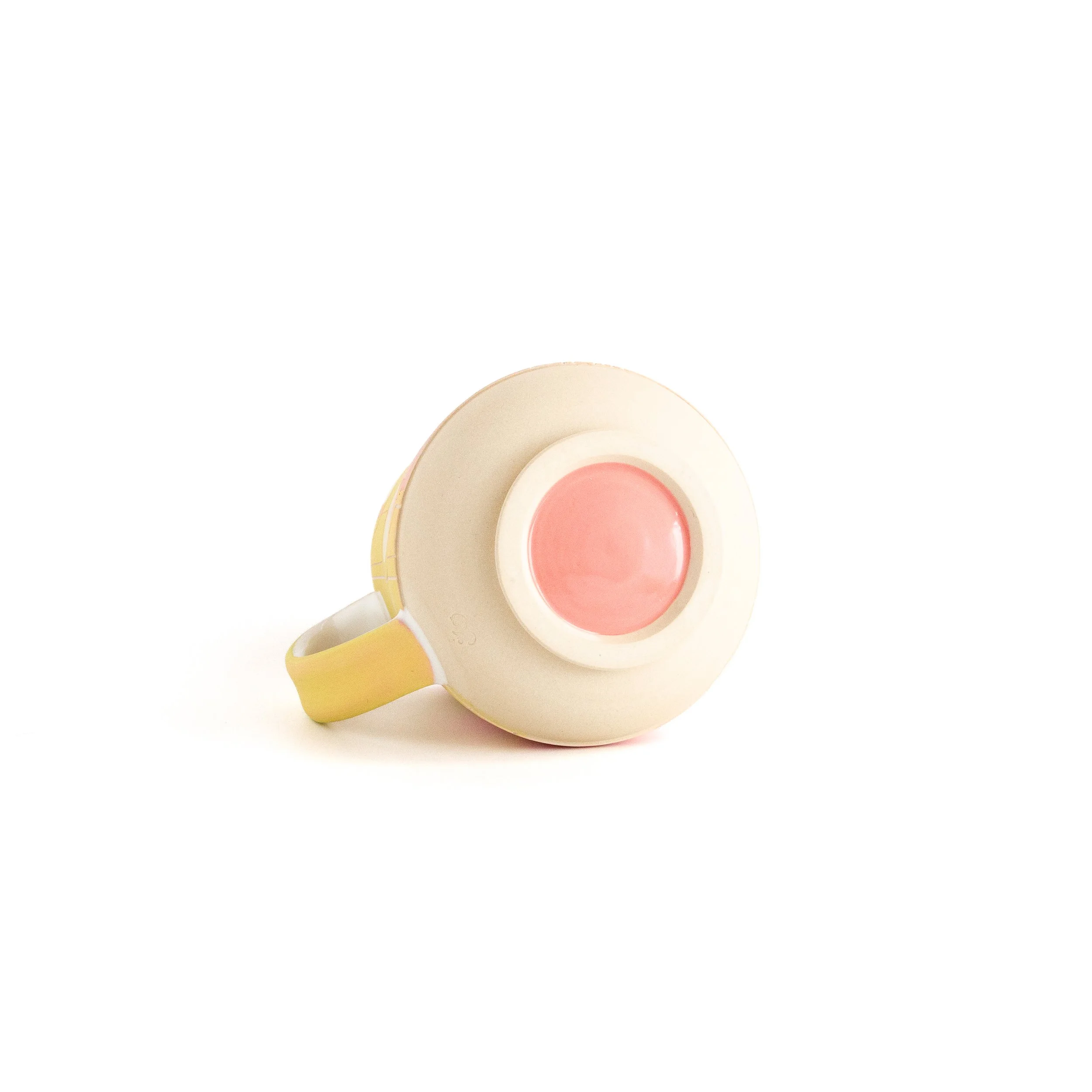 White stoneware mug handcrafted on the potter’s wheel. The interior of the cup and handle is finished with a bright, white glossy glaze. The exterior is created with layers of bright orange, dark red and white underglaze. Finish work includes hand carved circles. Holds 14oz. 4.25in tall x 3in rim.